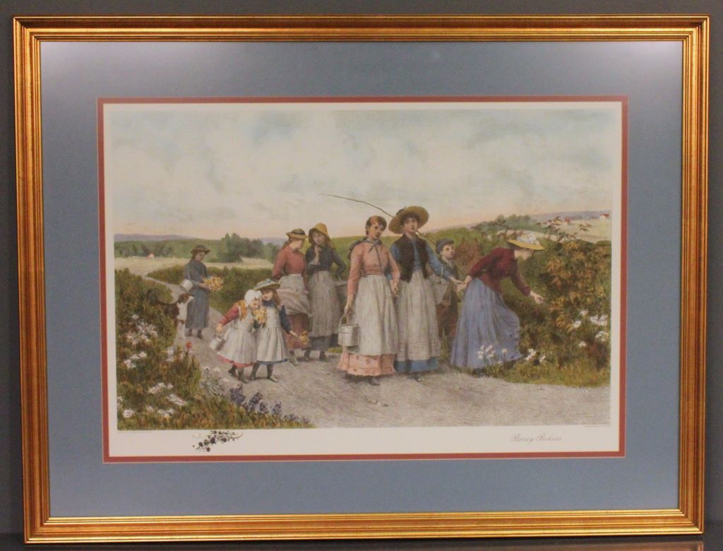 Large print entitled "Berry Pickers", originally painted by Brownscome, after etching by Jas S. King. 42 1/2" w., 32 1/2" h.