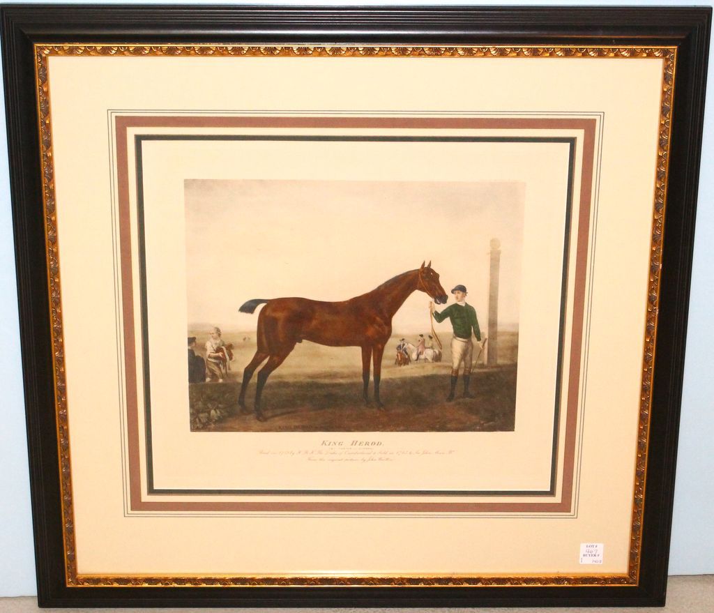 Hand colored print of Famous Horse King Herod. King Herod was famous running horse owned by Royalty. Illustrated by Mess, Fores, 41, Picadilly; 27 1/2" w., 26 1/2" h.