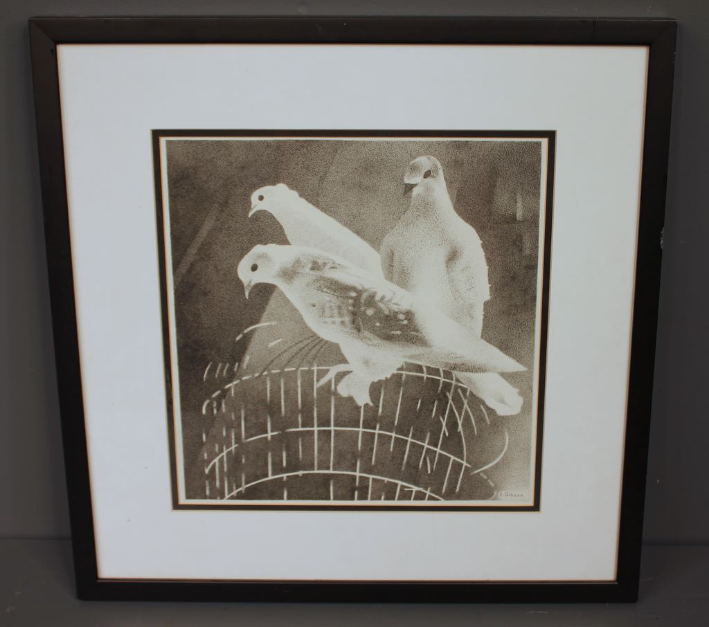 Print in Black and White of Three doves signed John Gibson. 19 1/2" w., 20"h.