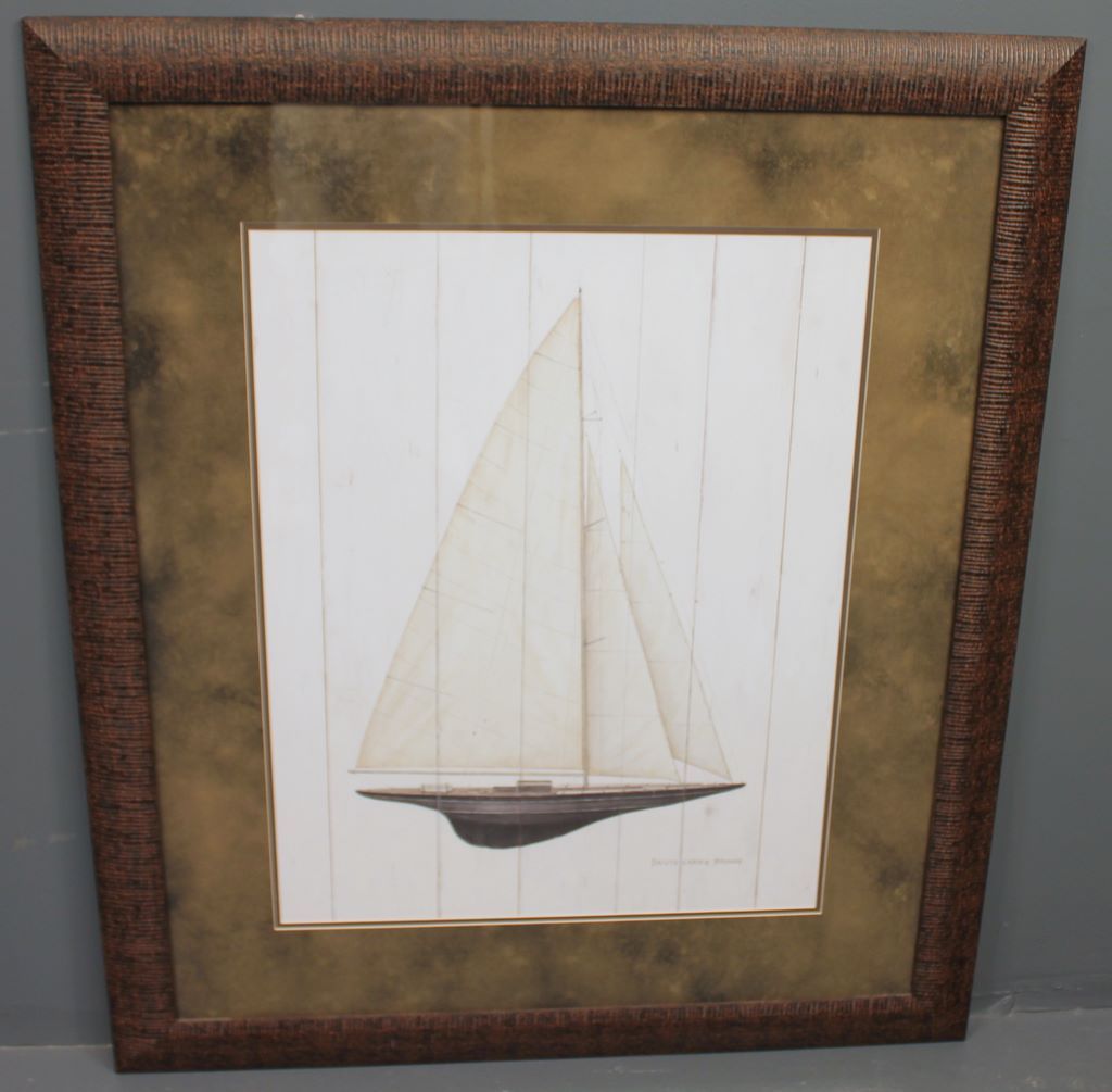 Large Print of Ship in Wood Frame; Signed David Cartier Brown. 35"w., 41 1/2"h.