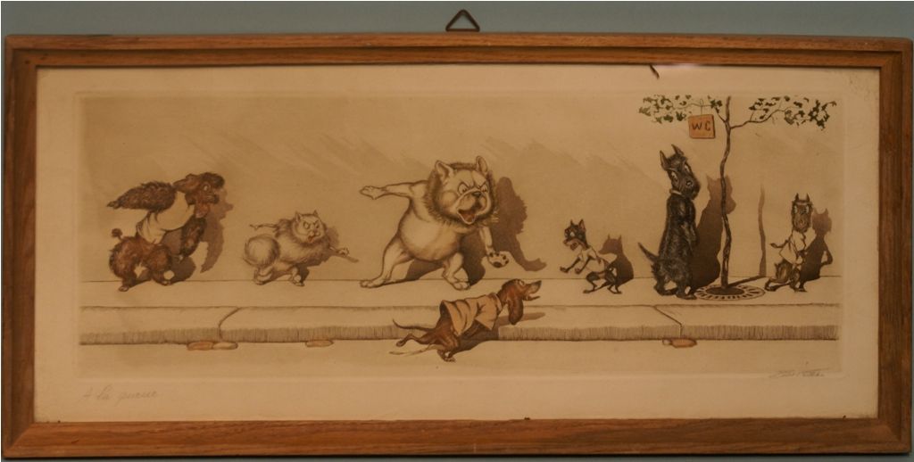 Artist Signed Vintage French Watercolor of Dogs, "Wait in line"