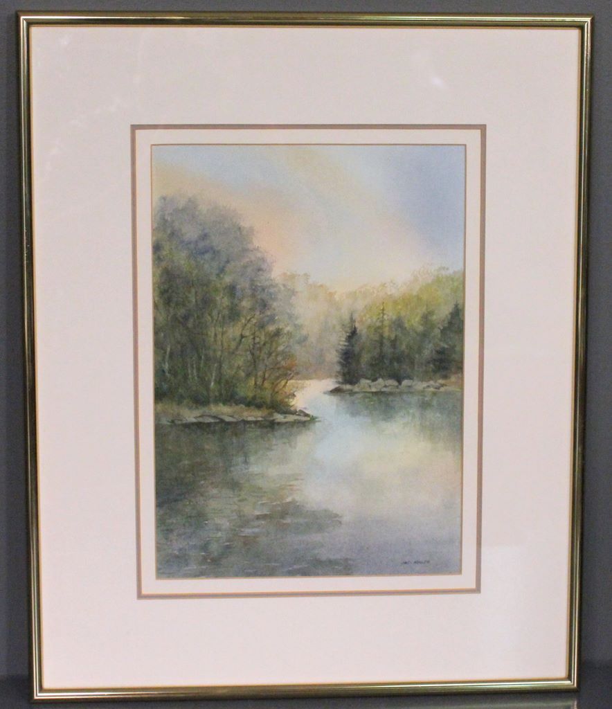 20th Century Watercolor of stream and trees painted by N.Y. artist Owen Wexler. Signed in lower right, professionally matted and framed. 18 1/2" w., 22" h.