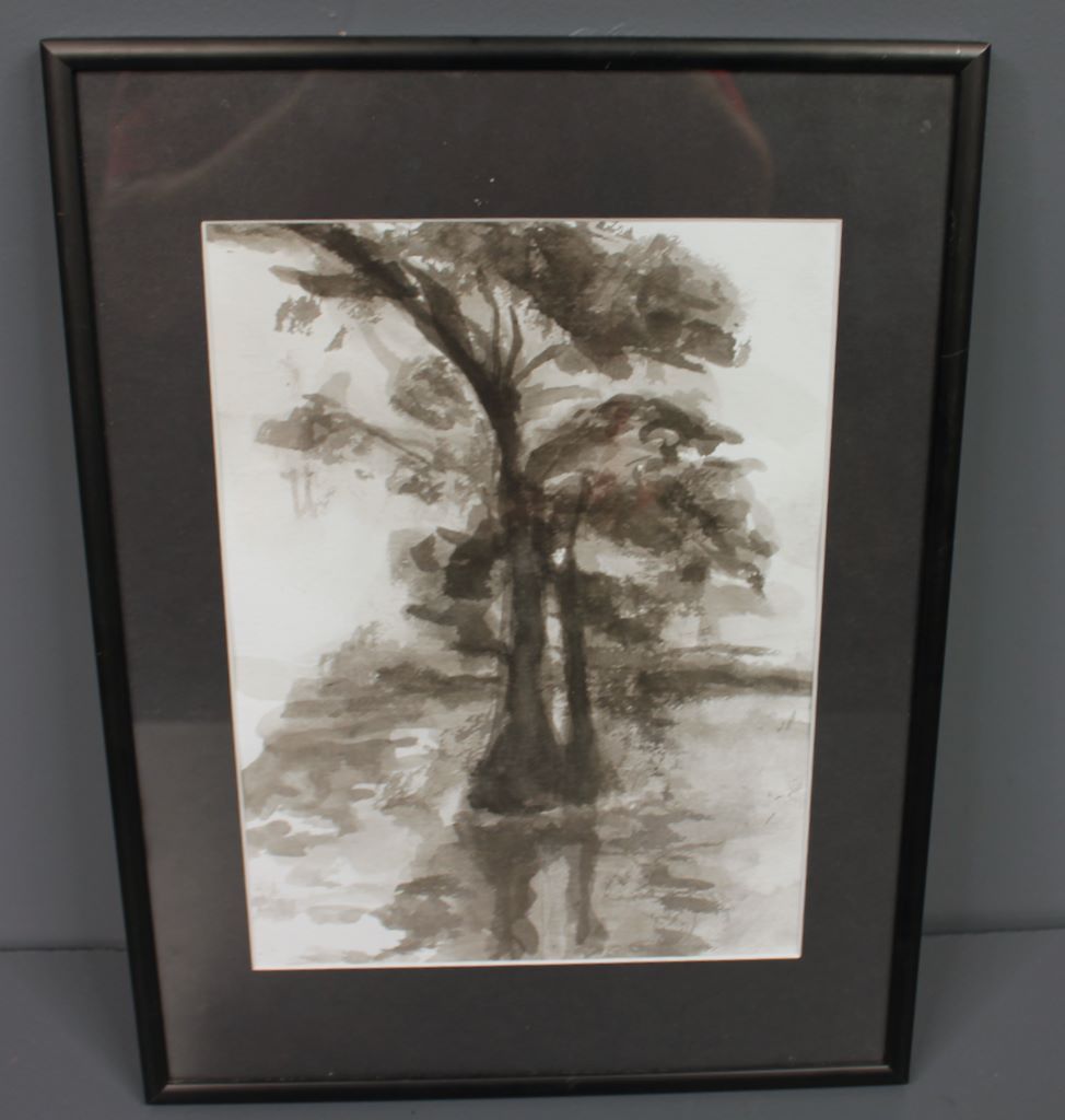 Watercolor of Trees, done in black and grey. 12 1/2"w., 16 1/2"h.