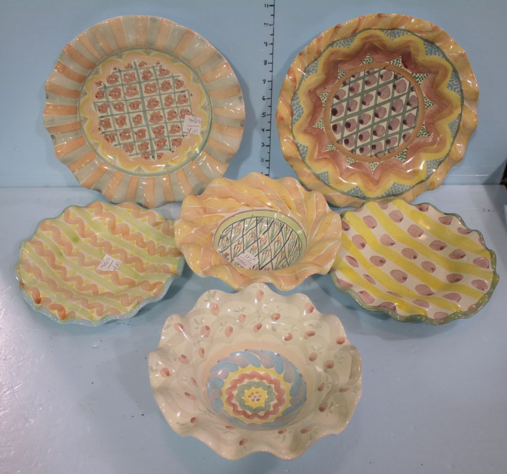 Group of MacKenzie Childs Ltd. Pottery Dishes, including; two ruffled plates 11" dia., 1 1/2" h., two ruffled salad plates 9" dia., two ruffled bowls 8 1/2" dia.