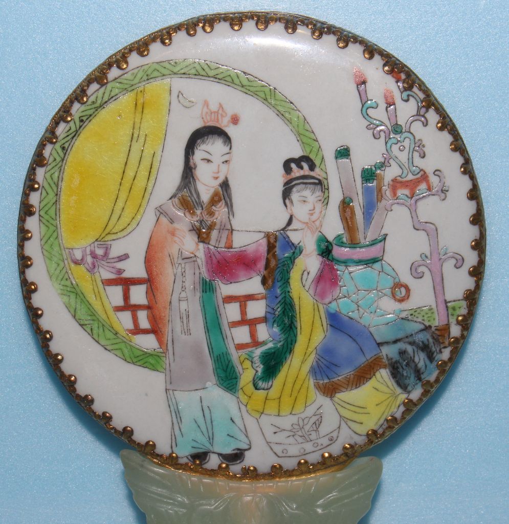 Porcelain hand painted hand mirror of maidens with jade handle in the original box. 4" w., 8 1/2" h.