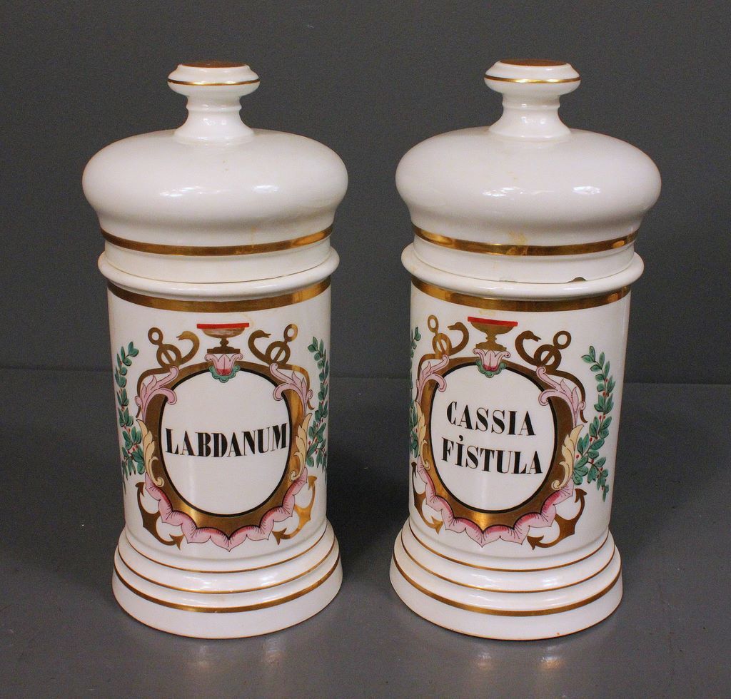 Pair of French Old Paris Apothecary Jars; pair hand-painted, inscribed Labdanum, and Cassia Fistula. Chips on one lid. 12 1/2" h., 5 1/2" dia.