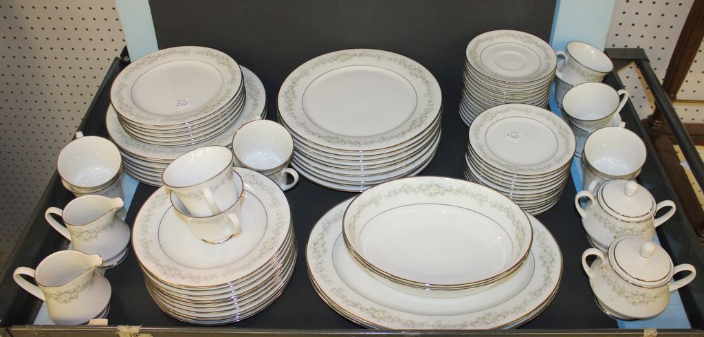 Set of China Consisting of Sixteen dinner plates, sixteen salad plates, thirteen bread and butter plates, sixteen saucers, ten cups, two vegetable bowls, two platters, two creamers, two sugars, 79 total pieces.