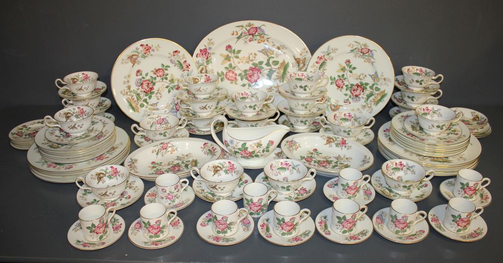 "Charnwood" china consisting of twelve dinner plates, twelve salad plates, eleven bread/butter, fifteen cups, seventeen saucers, platter, two serving bowls, eleven demi-tesse cups/ten saucers, two berry bowls, gravy, three bouillons, three saucers, total 101 pcs.