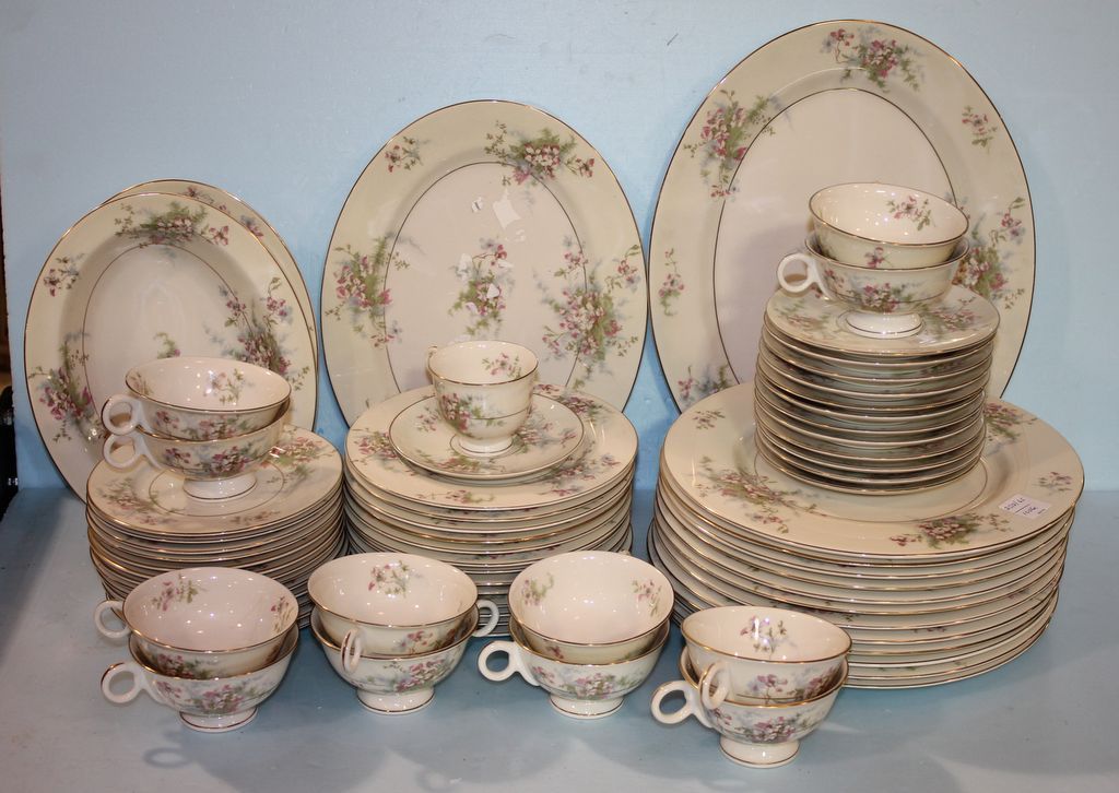 Set of Haviland "Apple Blossom" China, consisting of; twelve dinner plates, thirteen salad plates, thirteen bread plates, thirteen saucers (one chipped) one demitasse cup and saucer, twelve cups; total 65 pieces