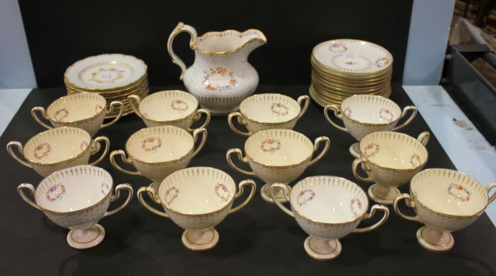 Set of twelve Minton bouillon cups, twelve saucers (two broken, no Tiffany mark), eleven 5 1/2" dia. Minton plates with Tiffany & Co. mark, pitcher (no Tiffany mark), matches previous lot