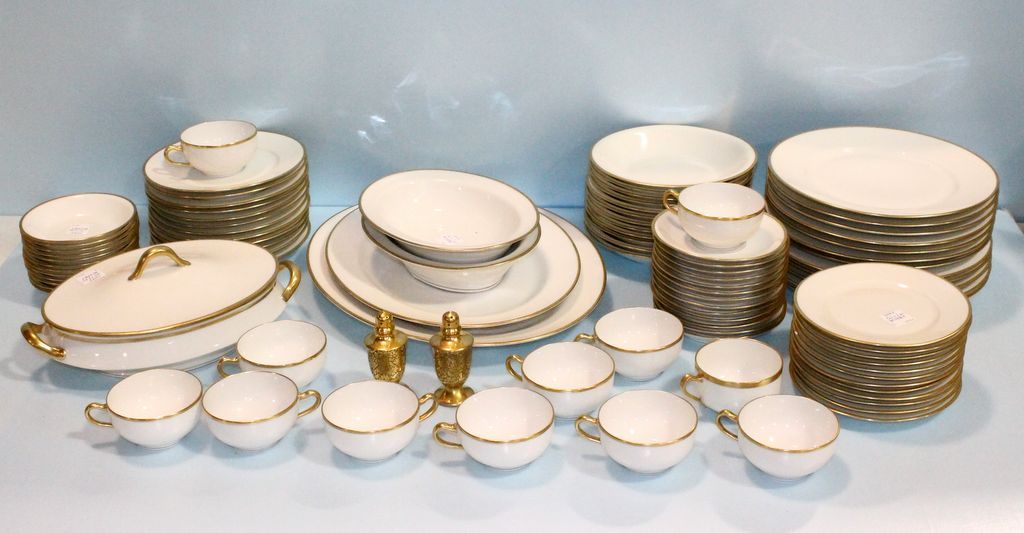Set of Theodore Havilland china consisting of twelve 9 1/2" plates , twelve 7 1/2" bowls, twelve 7 1/2" salad plates, twelve 6 1/2" bread/ butter plates, twelve 5" fruit bowls, thirteen saucers, twelve cups (one with crack) 12" w. covered tureen, two 9" vegetable bowls, one 13 1/2" platter, one 15 1/2" pepper shakers; 80 total pieces