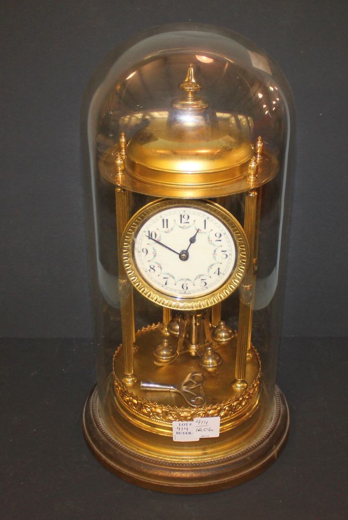 Jahreswhren Fabric 400 day German anniversary clock with porcelain dial, ball brass pendulum under glass dome with brass base, 16"h., 9"dia.