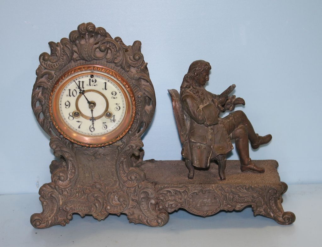 19th Century Spelter Clock with figure of man reading; 12" h., 14" w.