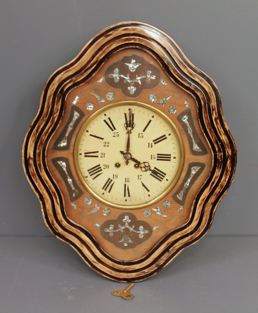 20th Century English Wall Clock with Painted Tin Dial, Mother-of-pearl decorated, has key. 19"w., 24"h.