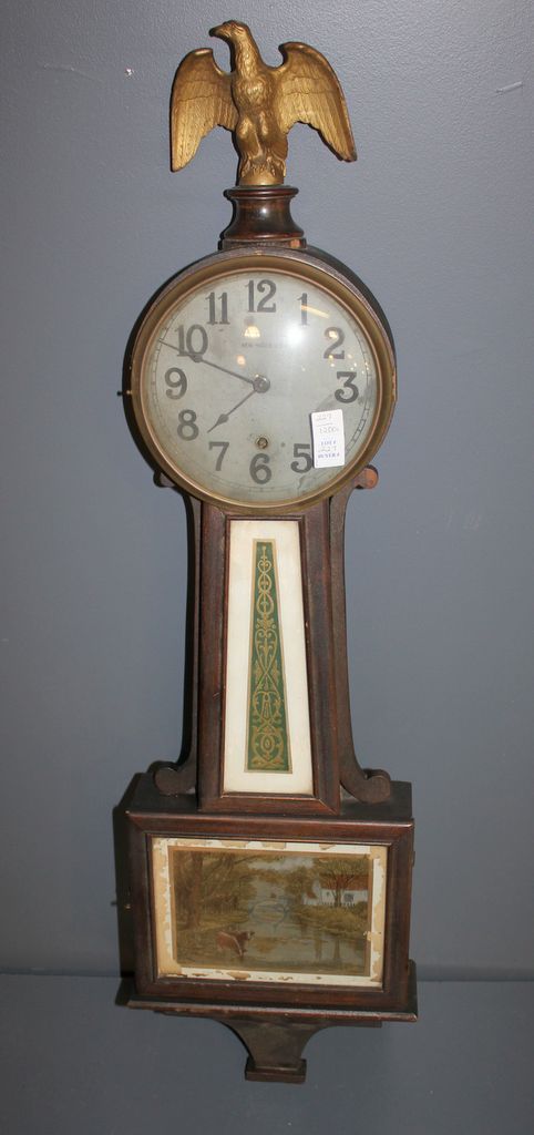 New Haven banjo clock with eagle and reverse painting, eight day; 42 1/2" h., 11" w.