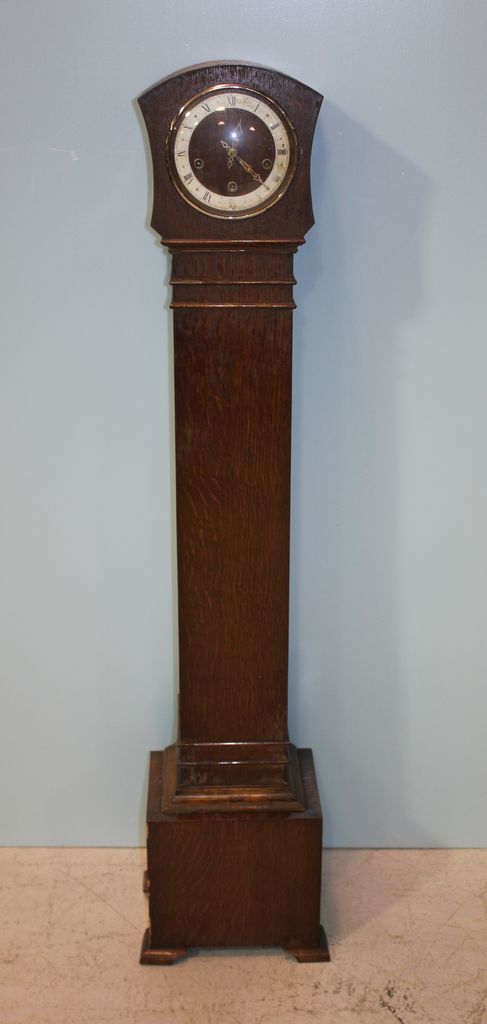 Early 20th Century Oak Grandmother Clock, made in England; 55" h., 7 1/2" d.