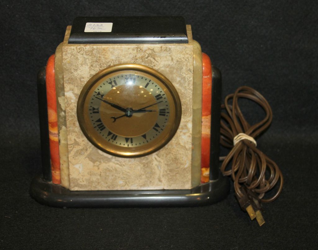 Art Deco Marble and Onyx Mantle Clock by Clock Products Co., Chicago, Il.; 5 1/2" w., 7" h.