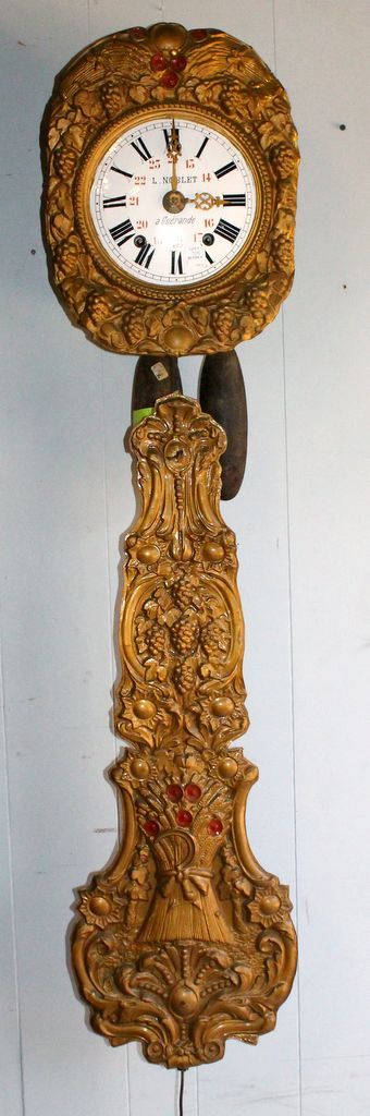 C. Noble - A. Guerande 19th century brass, enamel face "Wag on the Wall" clock; face, 12 1/2" w., 16" h.