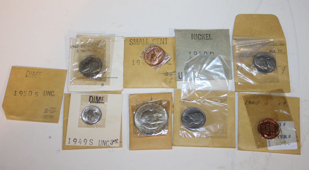 1942 Nickel proof, Jefferson Nickel 1940D, 1950 Dime Proof, 1949S Dime proof, Jefferson Nickel 1955 proof, 1955S Penny proof, 1949S Penny Proof, Jefferson Nickel 1956D proof.