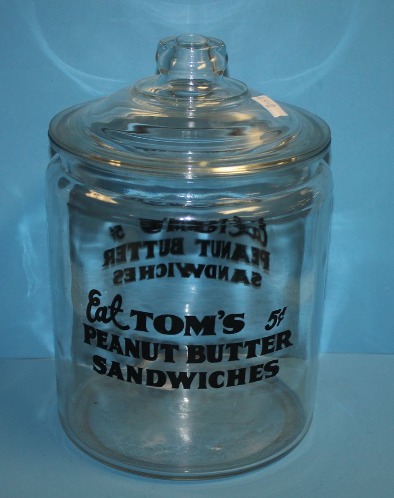 Large Tom's Jar with Lid, "Eat Tom's Peanut Butter Sandwiches" 13"h., 9"dia.