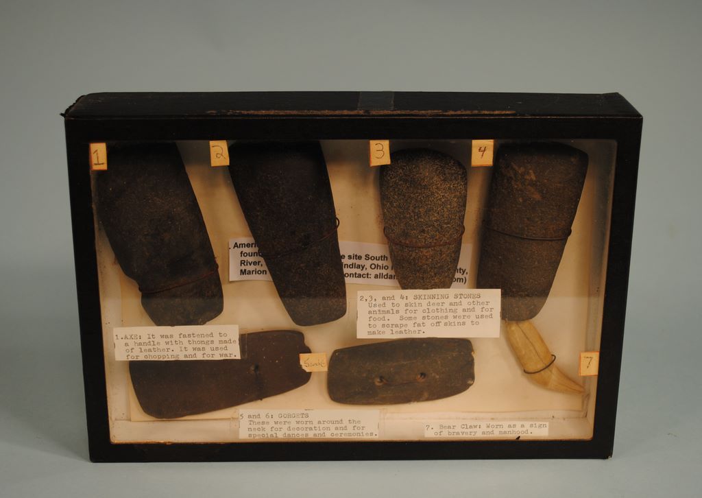 American Indian Artifacts consisting of axe, gorgets, skinning stones and bear claw.