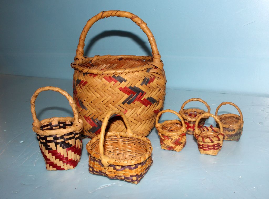 Seven chocktaw baskets that vary in size; 2 1/2" dia., 3 1/2" h. - 7" dia., 12" h.
