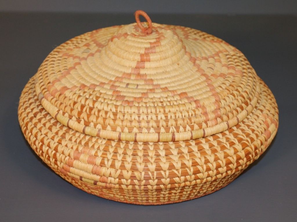 Indian Pine Needle Sewing Basket with lid, bottom of basket has a beautiful multi-color design. 12" dia., 6" h.
