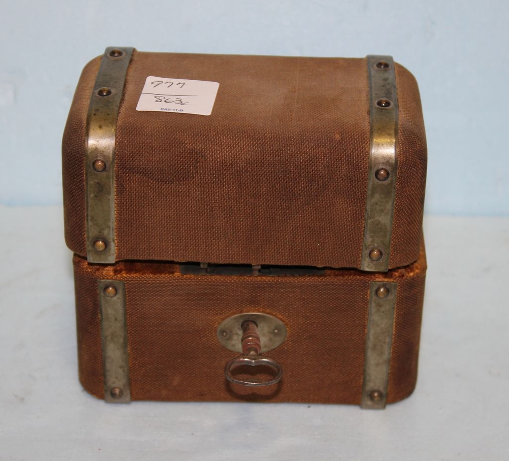 Two 19th Century small bottles in original cloth covered box with key; 5" w., 4 1/2" h.
