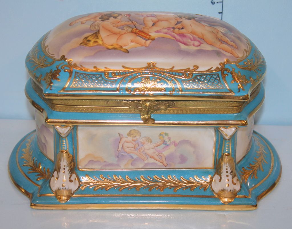 Blue and Gold Sevres Glove Box with Painted Cherubs; 7" h., 11" w., 7" d.