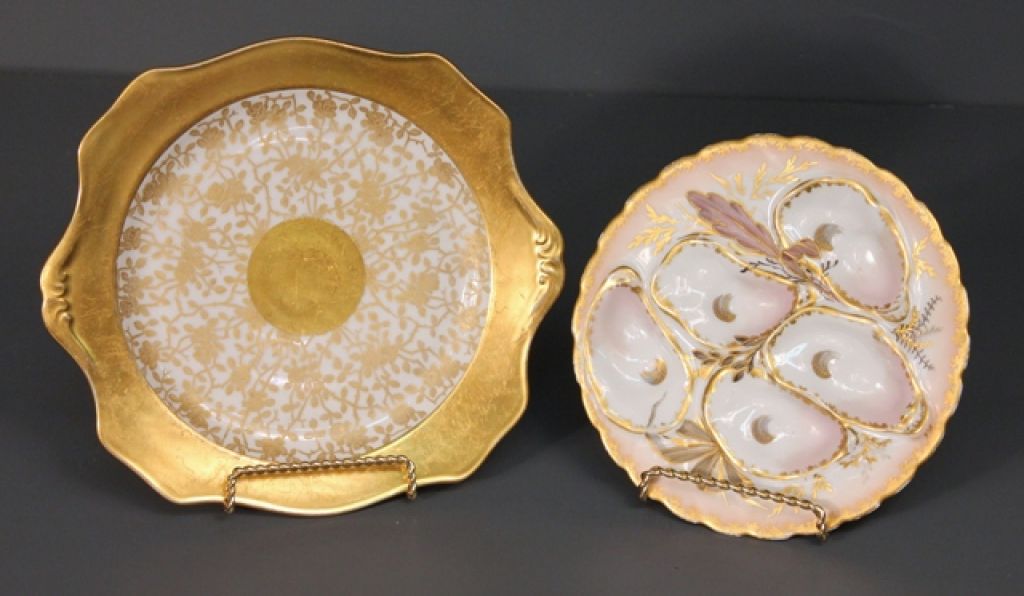 Two Hand-Painted Plates; Wheeling decorated gold gilt cake plate (10" dia.) hand painted porcelain oyster plate.