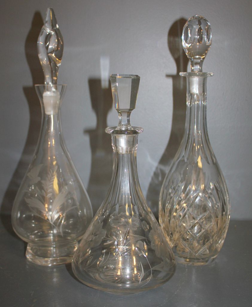 Crystal decanter 15"h., etched glass decanter 15"h., cut glass decanter 11"h.