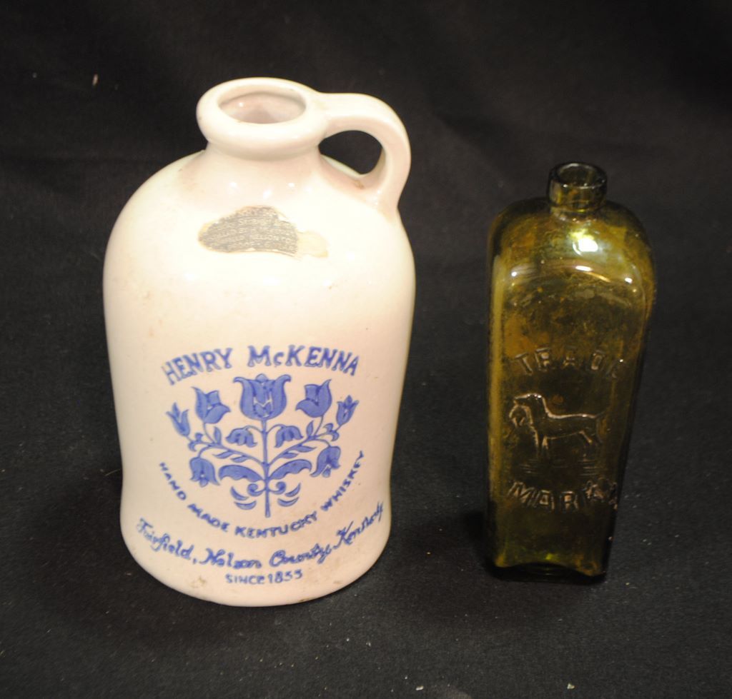 Henry McKenna blue and white jug H. 10" and J.J.W. Peters green bottle H. 8 1/2"
