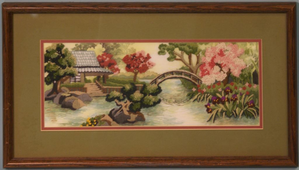 Needlework Picture of Hut and Bridge, 23"w x 12 1/2"h