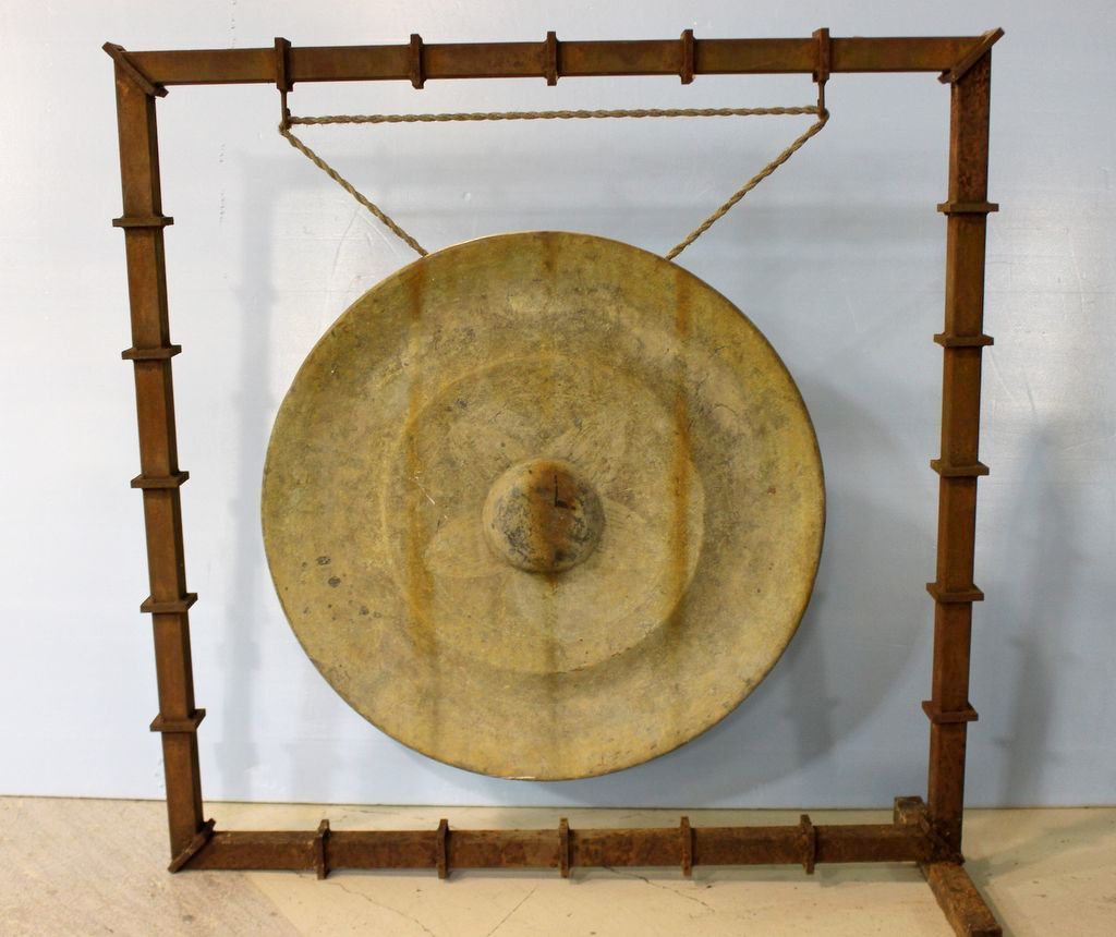 Oriental gong; stand. Missing one foot. 40" w., 40 1/4" h. ; gong, 6 1/2" dia.
