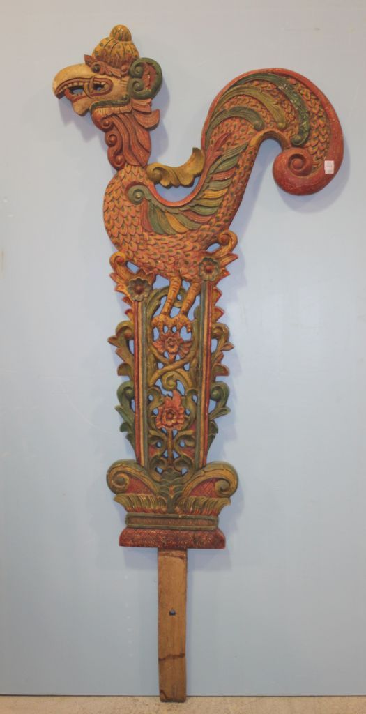 Life-size painted and carved rooster, probably done by Bali artist. These were used on house roof tops. 32" w., 75" h.
