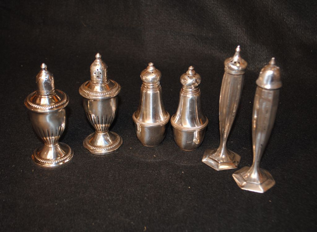 3 Pair of Salt and Pepper Shakers. Two marked Sterling, One " WE" manufactures Sheffield. 6" h, one H. 4 1/2", H. 5 1/2"