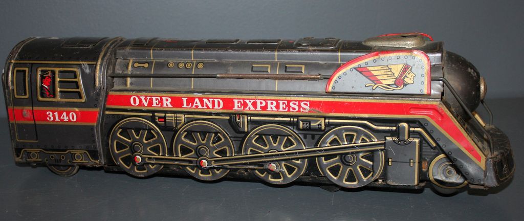 Vintage Marks tin litho locomotive, battery operated, Indian chief logo, rubber tires #3140 made in Japan.
