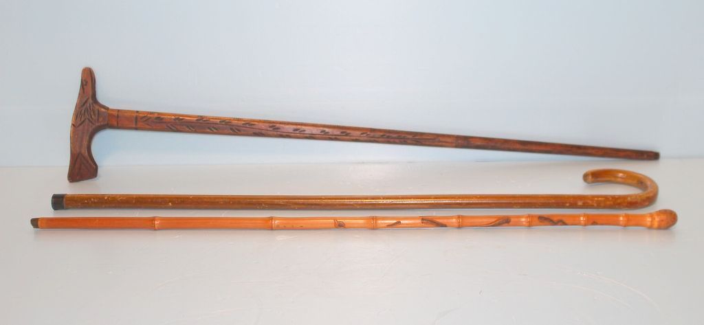Group of three antique canes. Vintage Chinese bamboo (signed) walking cane with snake design, 34" h. Antique hand carved vintage cane, 36 1/2" h. Simple antique walking cane, 34 1/2" h.