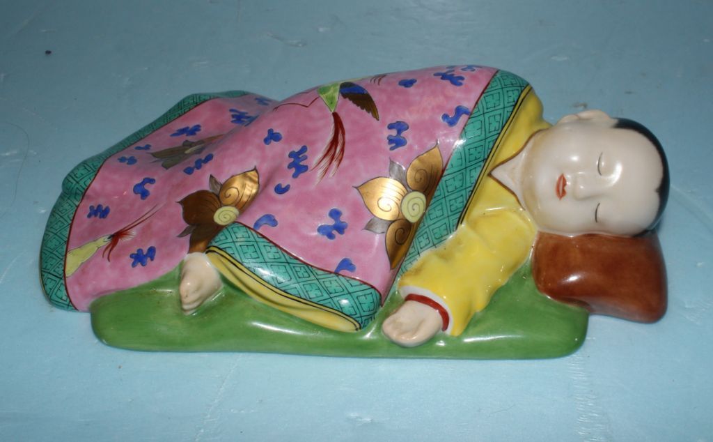 Hand painted Chinese wall pocket of child sleeping. Blue mark on the back which says Herend, Hungary; 4 7/8" w., 7 1/4" h.