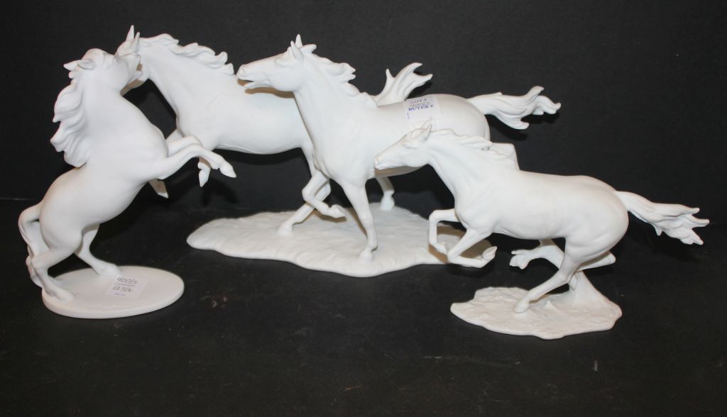 Two single figurines of horse and one with two running horses; 8" w., 13" w., 8" h.