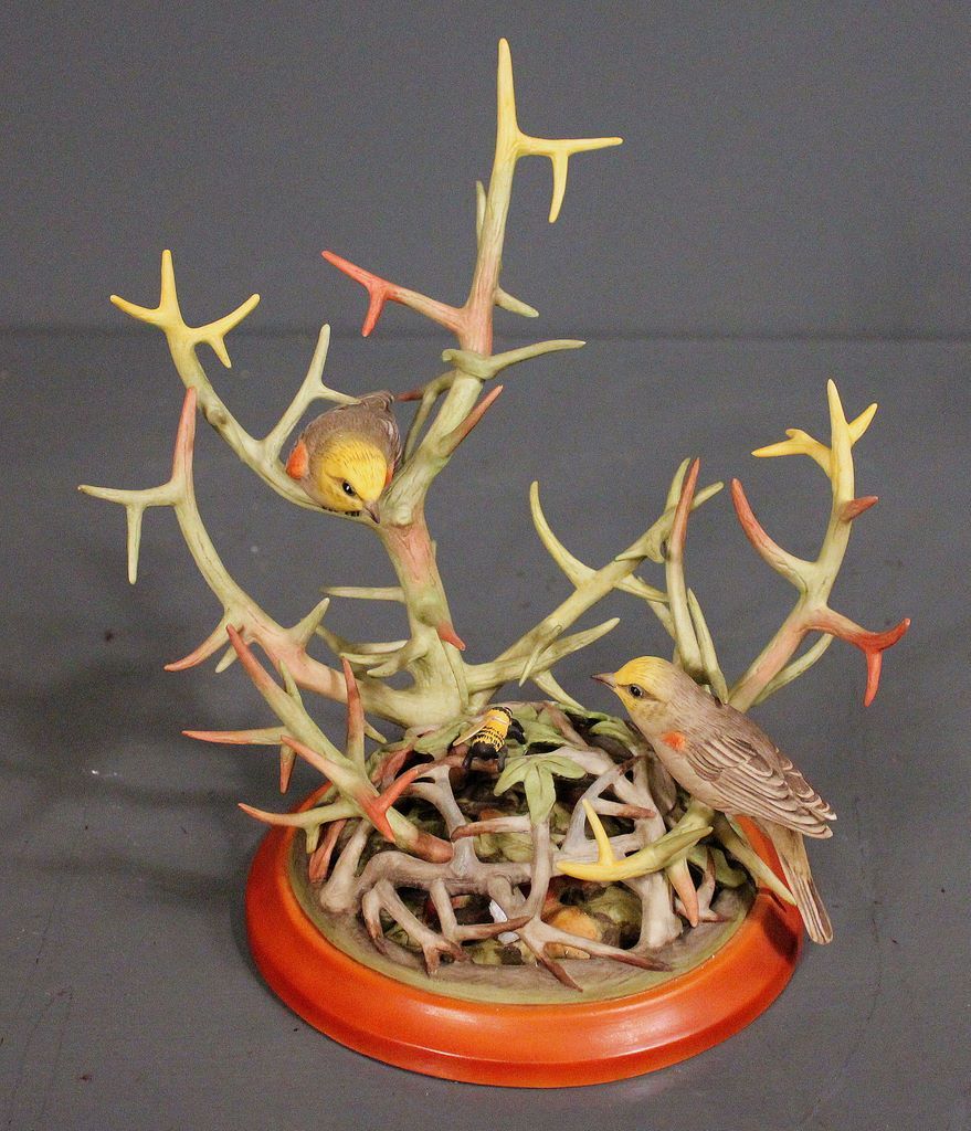 Boehm Porcelain Figurine of Verdins; intricate porcelain group with birds and bee on thorns #400 No Damage, 8 1/2" h 8" w.