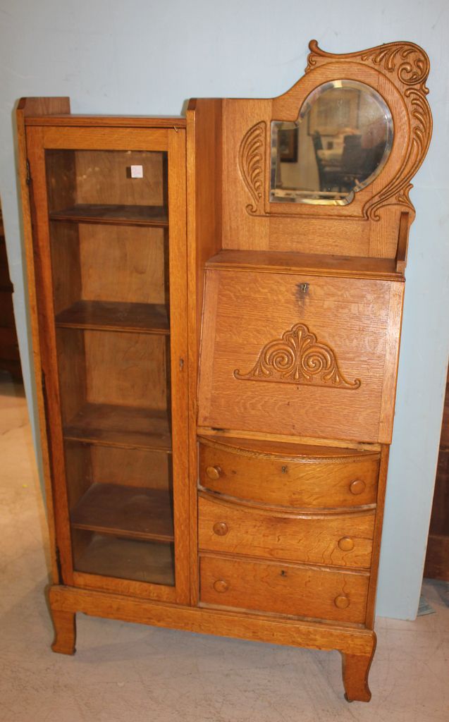 Oak Side by Side Secretary with Beveled Mirror; 66" h., 35" w., 14" d.