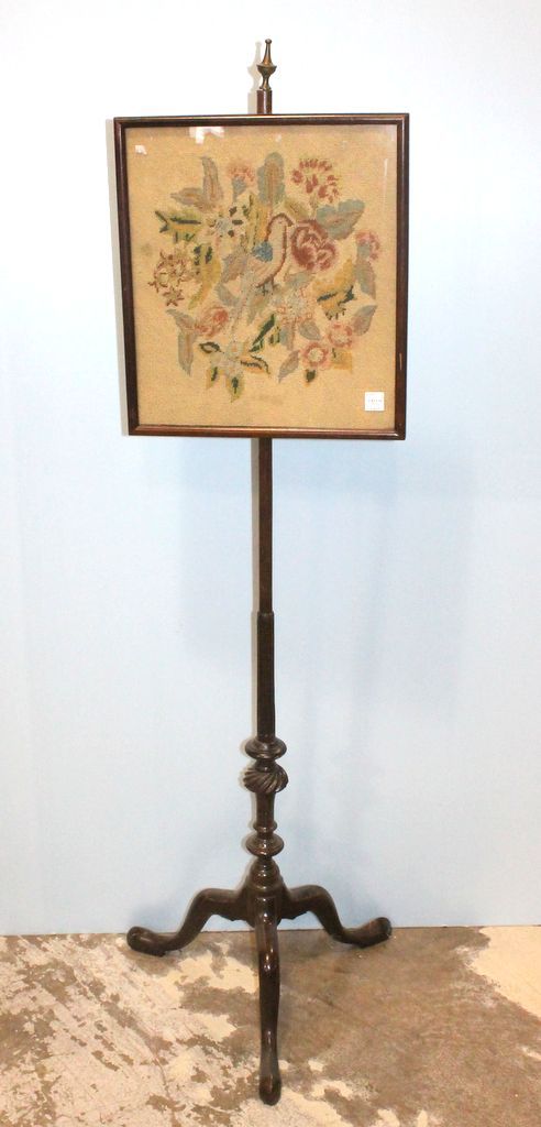 19th century mahogany Queen Ann style pole screen with needlepoint; 59" h.