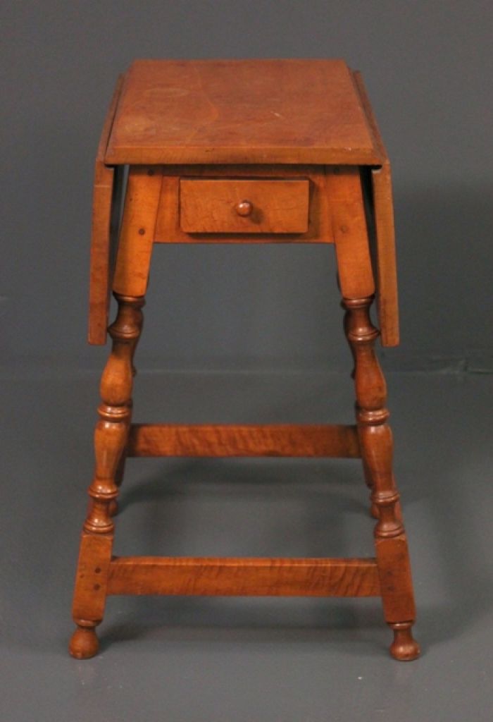 Early 19th Century Maple Drop Leaf Table. Rare tiger maple drop leaf table with one drawer. Top 11" w., 19 1/2" d., 25 1/2" h., each leave 8 1/2" w.
