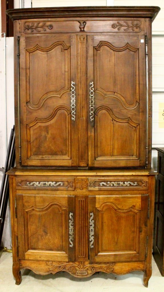 19th century French armoire in two sections. Walnut provincial French buffet du corps. Top section has two doors with fish hinges, decorative front hardware. Bottom section has two drawers over two doors supported by French legs. (Smoke damage); 5 1/2" w., 24 1/2" d., 99" h.