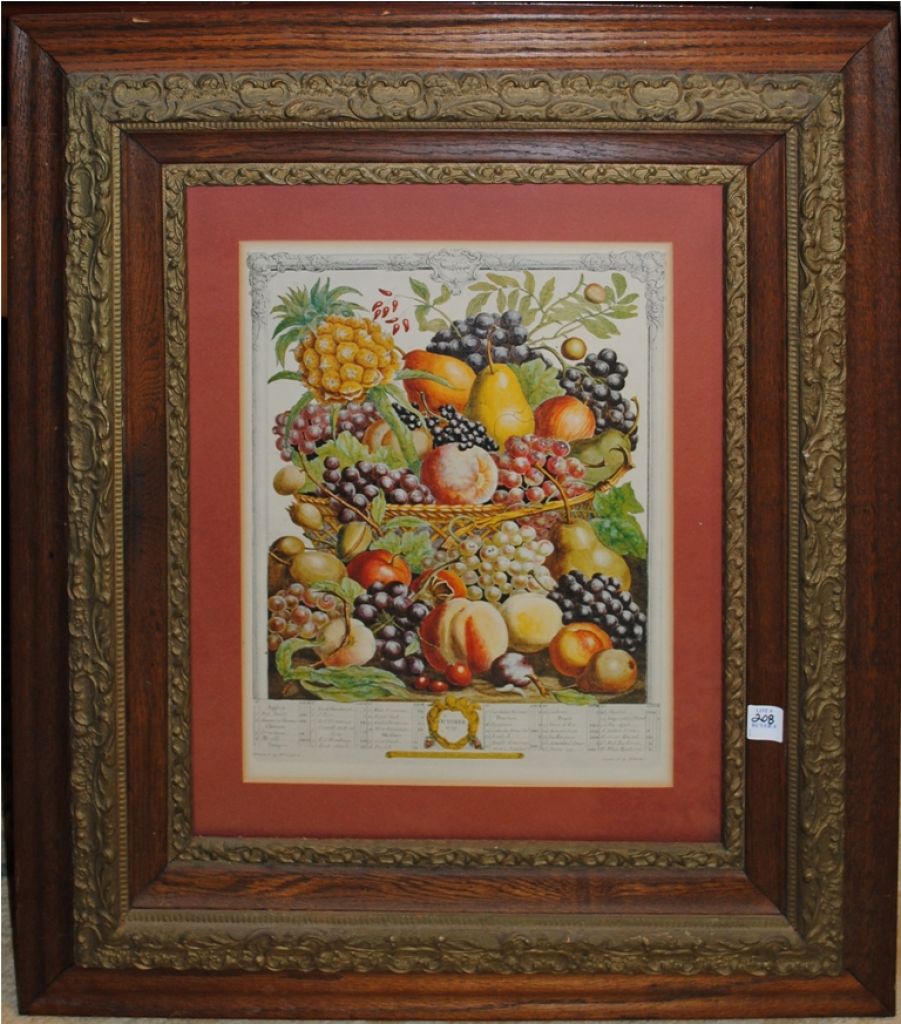 Late 20th Century Print of Fruit in antique oak frame, 26"w x 30"h