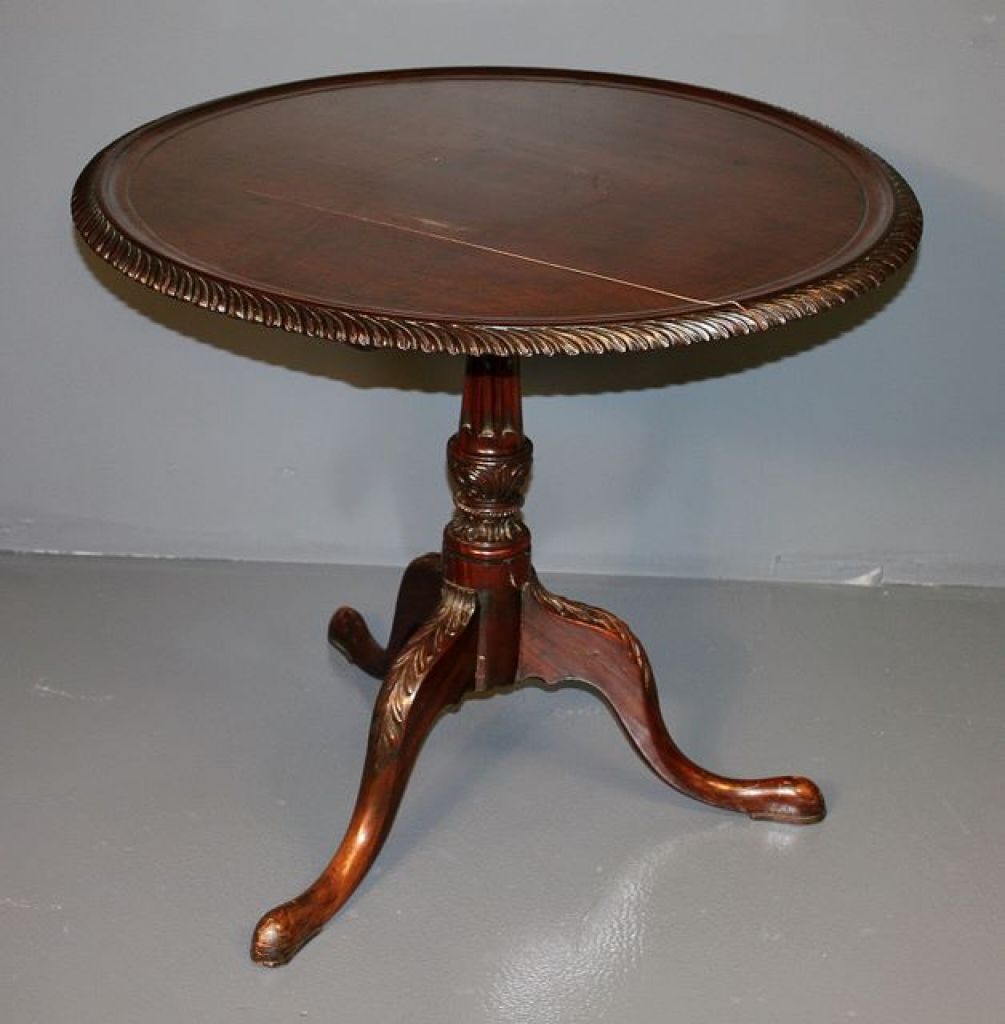 20th Century Mahogany Tilt Top Table; with gadrooning on edges, carved pedestal, snake foot with leaf carving, one foot repaired; 32 1/2" dia., 28" h.