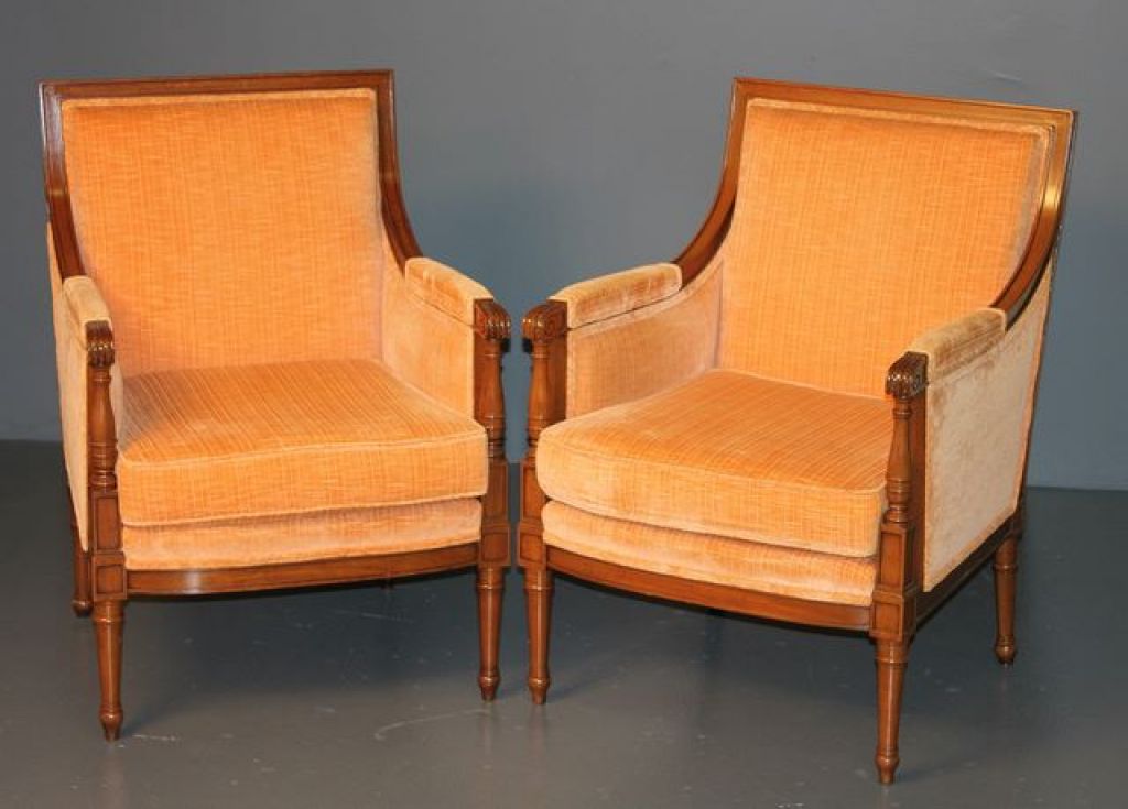 Pair of Contemporary Walnut Arm Chairs; contemporary club chairs covered in velvet; 23 1/2" w., 26 1/2" d.
