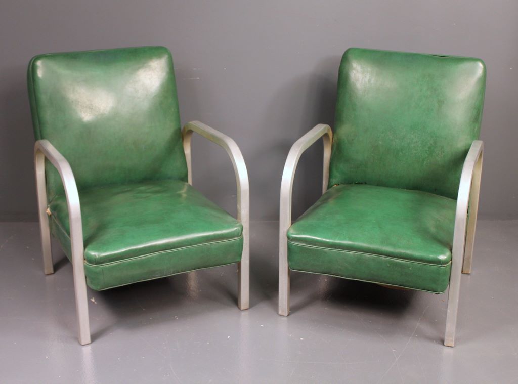 Pair of Vintage Chrome Arm Chairs with green leather seats, AF Inc.; 25 1/2" w., 27" d., 33" h.