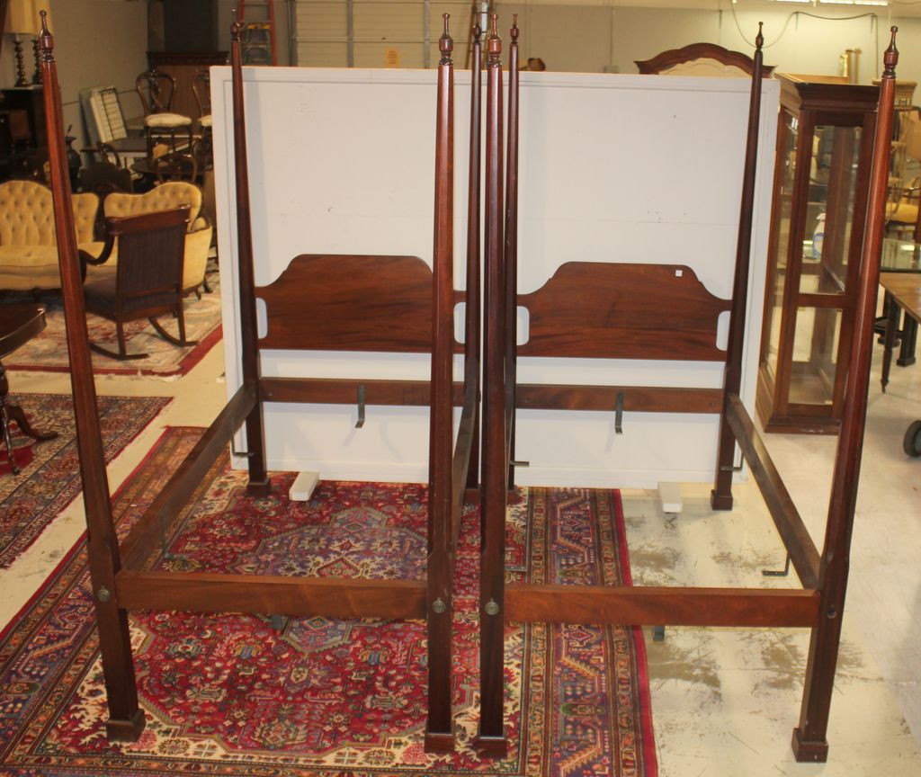 High quality twin size poster beds made by C.J. Baker, dated 1985. Baker was a furniture maker in Jackson, Mississippi.; 90" h.
